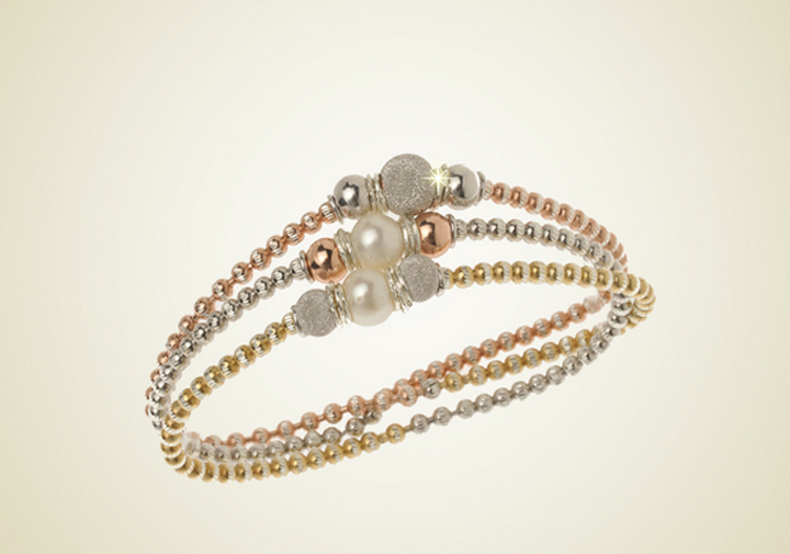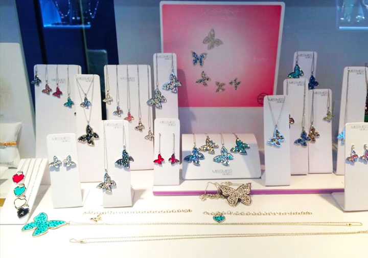Dall'idea dell'architettura del Palladio, famosa per i suoi modelli che hanno influenzato l'arte greco-romana, nasce la collezione "Palladio" dalle forme geometriche e sinuose nei colori argento, oro, perle, con pietre dure e colorate: quarzi, turchesi, ambre.